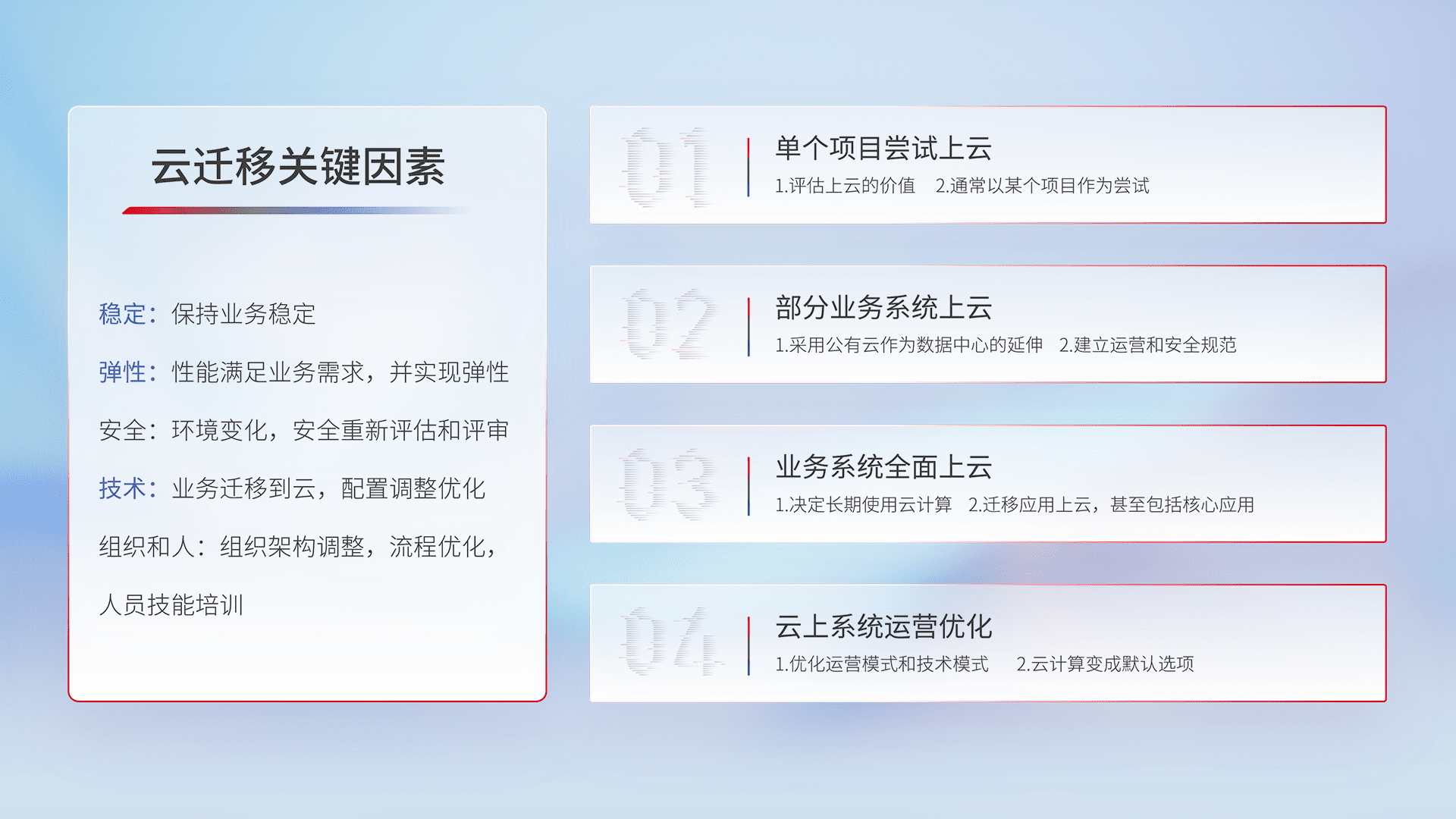 结合实际业务,,,,从规划设计、、、云平台选型、、、云原生改造、、、、数据迁移、、、、集成交付,,,,迁移全过程为客户识别最佳上云路径,,,做好风险识别管理,,,设计网络架构、、身份权限、、、、安全审计合规、、操作审计、、、日志审计、、、、监控告警策略、、多站点容灾设计等,,,对云上基础设施进行整体规划,,,,提升IT治理水平,,以满足弹性、、、高可用、、高性能的需求。。。