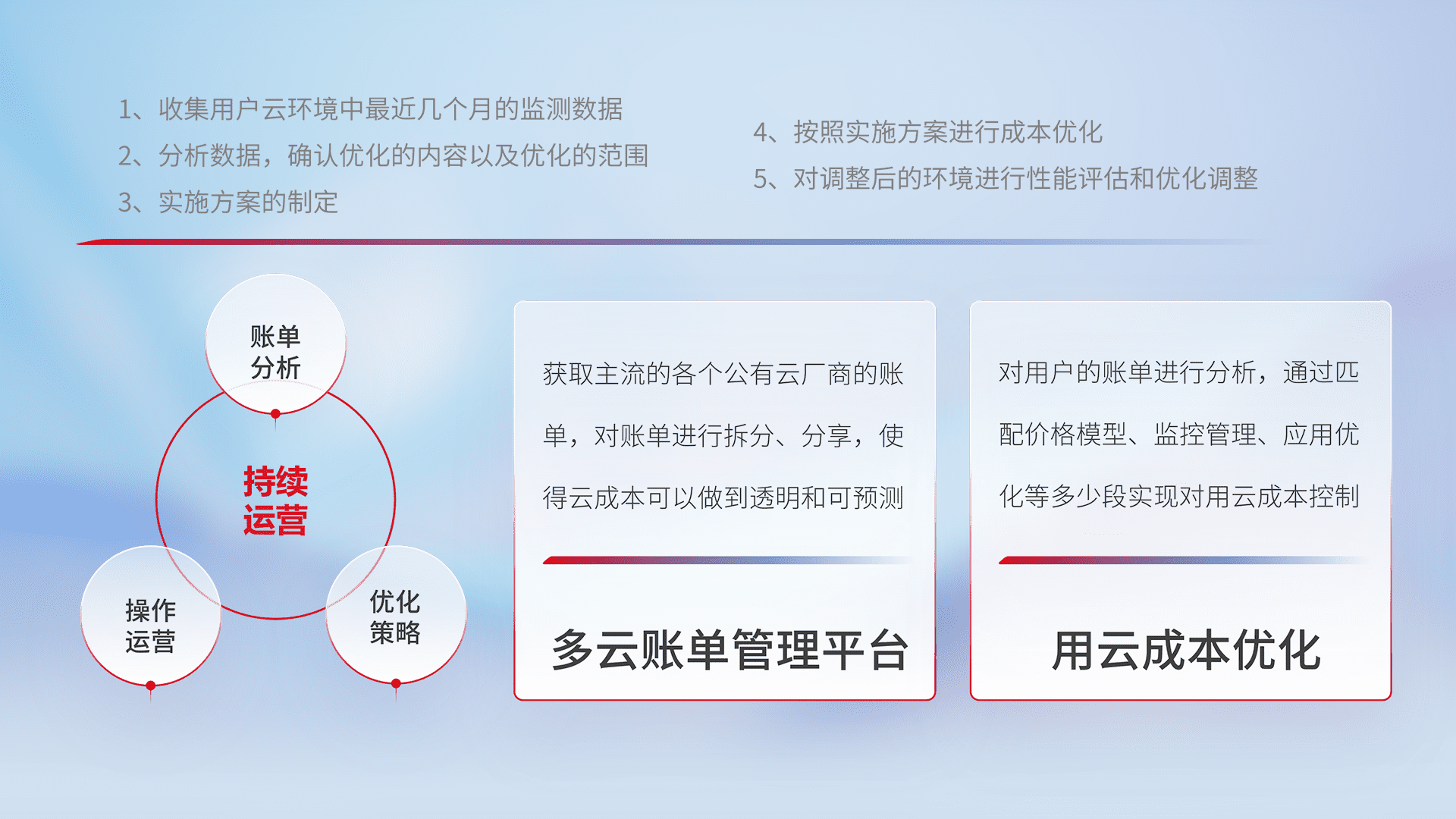 通过多云纳管,,,以统一的资源数据模型把客户的云资源进行抽象和封装,,,,进而实现对多云资源的统一操作,,,保障云资源管理的可靠性、、、、稳定性与可用性。。。量身定制化运维内容,,,,配置、、、开发运维、、、、补丁管理、、、、备份、、监控、、认证和访问管理、、审计和日常巡检等,,,,保障在用云过程中的可靠度,,,稳定度以及高可用率。。