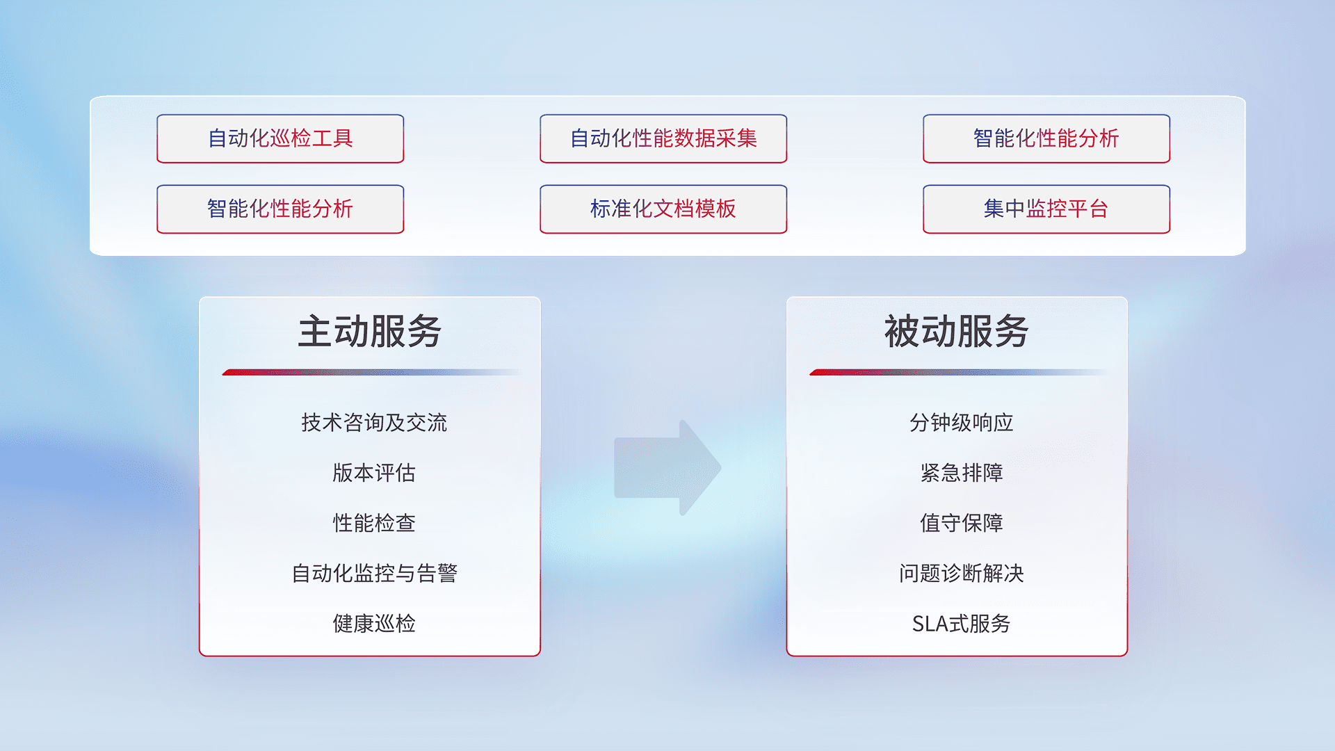 智能化工具和标准化文档,,,,保障服务质量,,,提供主动服务(包含技术咨询、、、、版本评估、、、、性能检查、、、、自动化监控与告警、、、、健康巡检)和被动服务包含(分钟级响应、、、、紧急排障、、、、值守保障、、、、问题诊断解决、、SLA服务)。。。